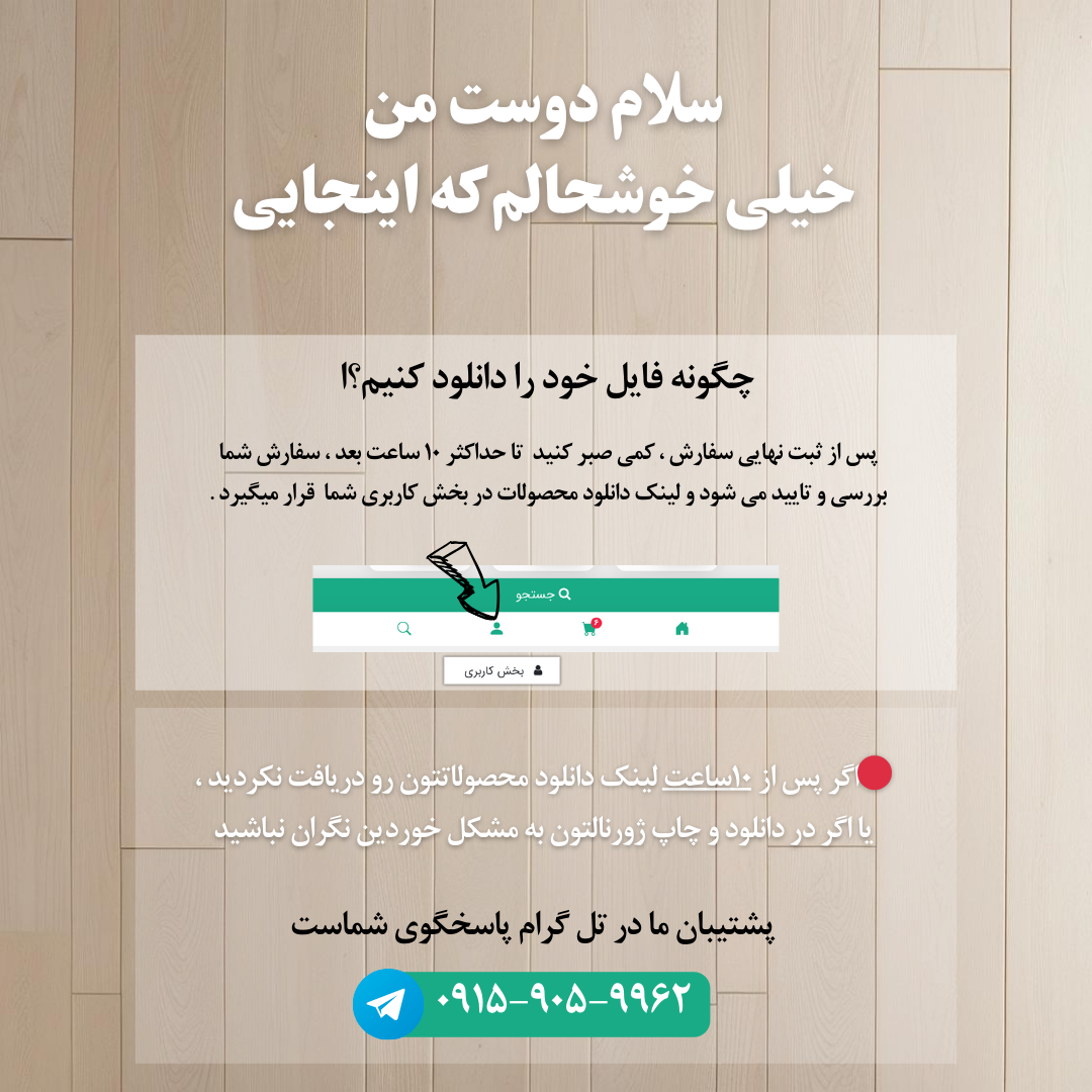 *اگر مشکلی در دریافت محصول داشتید لطفاً به من پیام دهید ،من می توانم فایل را مستقیماً برای شما در تلگرام ارسال کنم* ( پشتیبانی تل گرام ۰۹۱۵۹۰۵۹۹۶۲ )