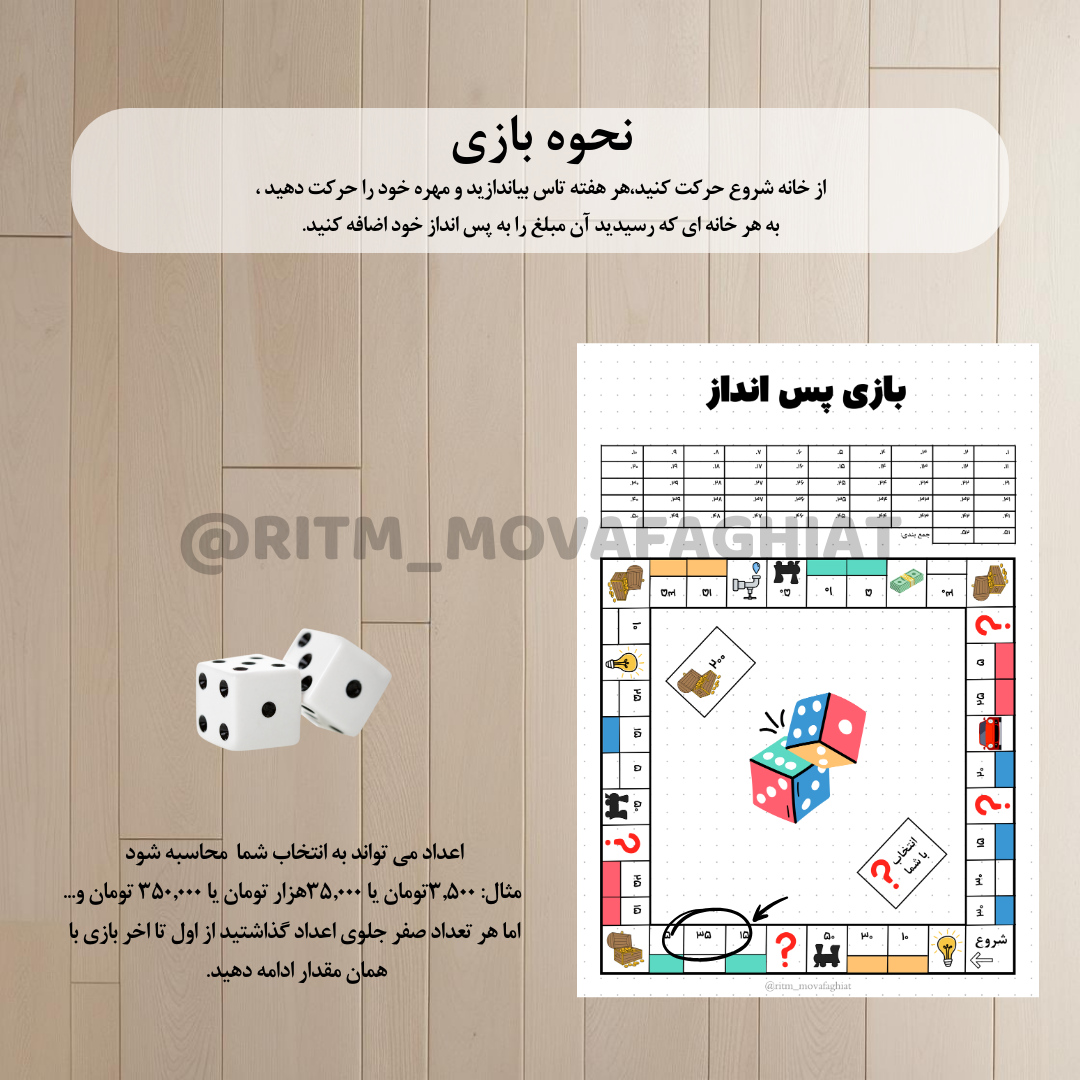 پس انداز هفتگی پول با بازی مونوپولی! در ابتدای صفحه 52 هفته دارید که برای یکسال شماست ، اخر هر هفته صفحه ژورنال رو باز کنید ، تاس بیاندازید به تعداد عدد های تاس از خانه شروع یا خانه ای که هفته پیش به آن رسیده بودید ، حرکت کنید ، به هر خانه که رسیدید آن مبلغ را در هفته ی جاری بنویسید (بالای صفحه) و سپس به همان مقدار پول به پس اندازتان بی افزایید.