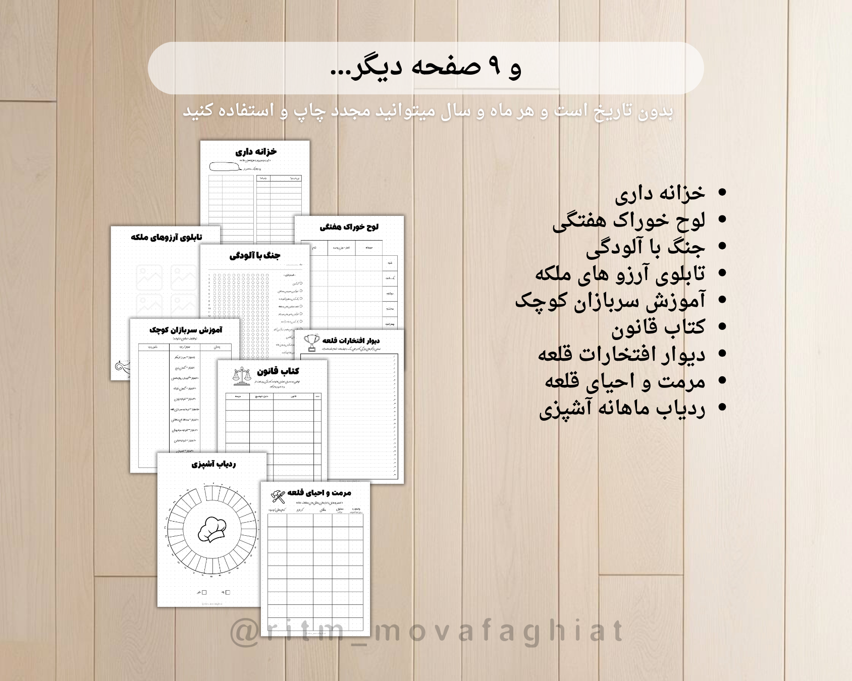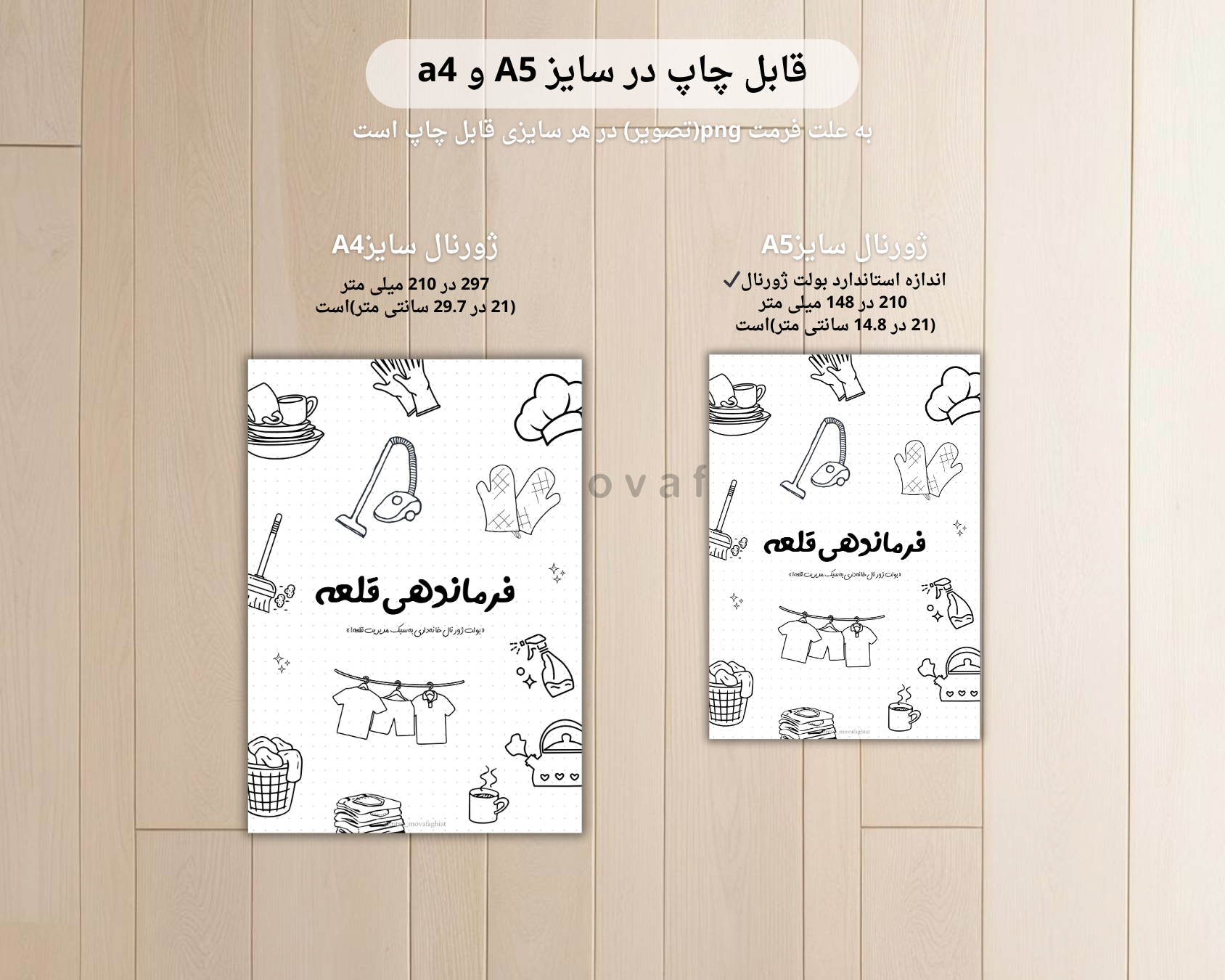 تو فرماندهی قلعهای هستی که اسمش “خونه” است و این ژورنال، دفتر فرماندهی توئه. با این ژورنال:همه کارها و برنامهها زیر نظر فرمانده قلعه (تو!) پیش میره . وظایف روزانه، مثل مأموریتهای سلطنتی، با افتخار انجام میشن .قوانین، مدیریت هزینه ها، دستور پختها و حالوهوای فرمانده، همه در یک کتابچه منظم و زیبا ثبت میشن .از آشپزخانه تا خزانهداری، همه چیز تحت کنترل توئه. — چرا باید داشته باشی؟ چون هر قلعهای به یک فرمانده نیاز داره — و این ژورنال، سلاح و نقشه ی شماست برای اداره زندگی با نظم، لذت و بدون آشفتگی.