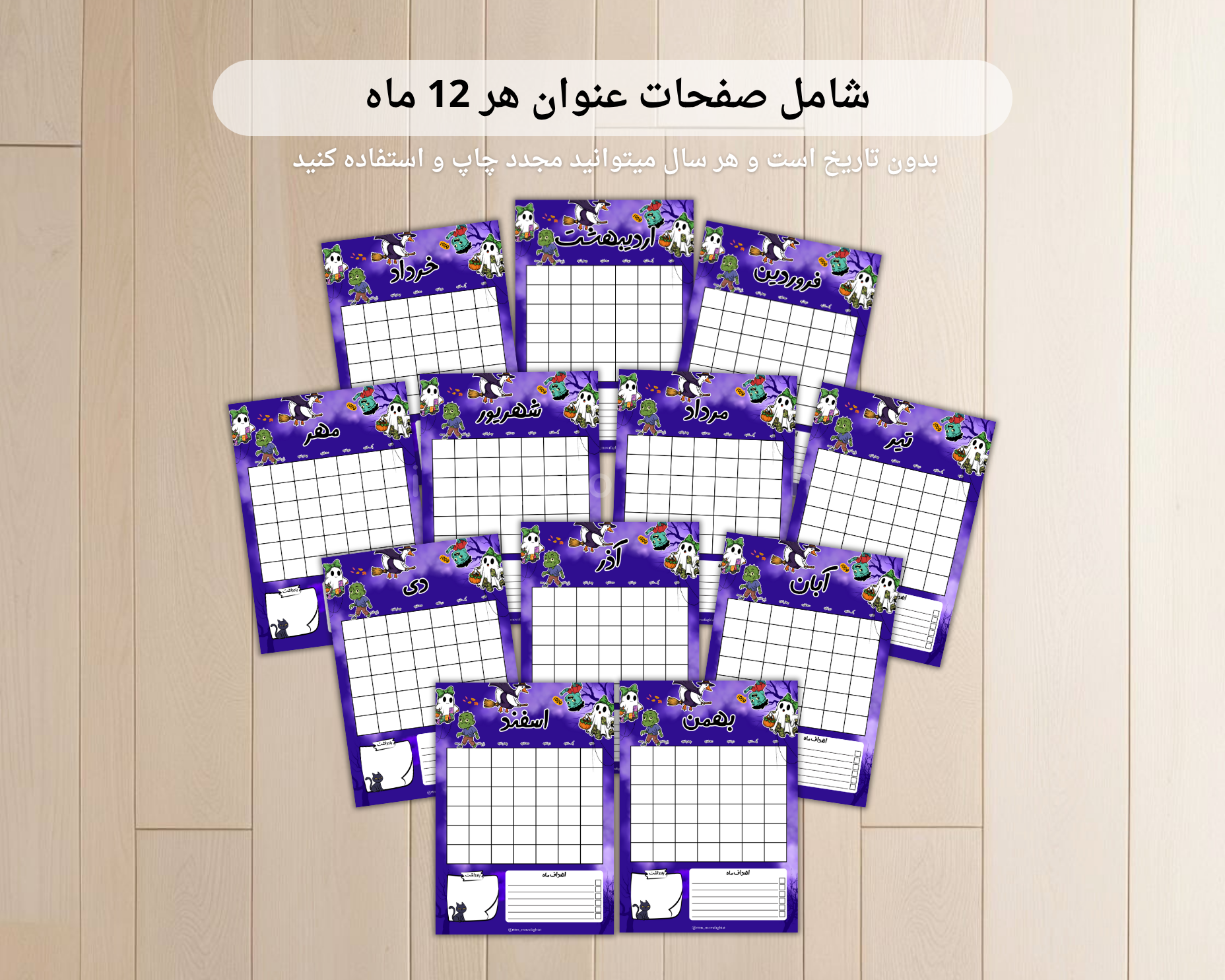 شامل همه ماه ها، تقویم قابل چاپ ، برای برنامه ریزی و هدف گذاری ماهانه،صفحات وظایف ماهانه