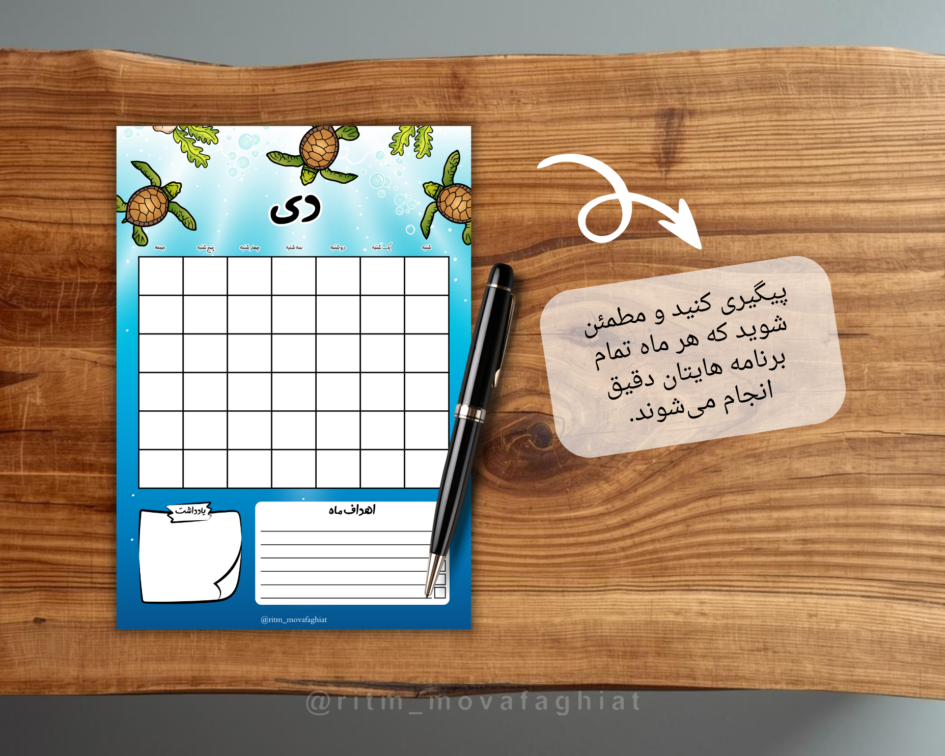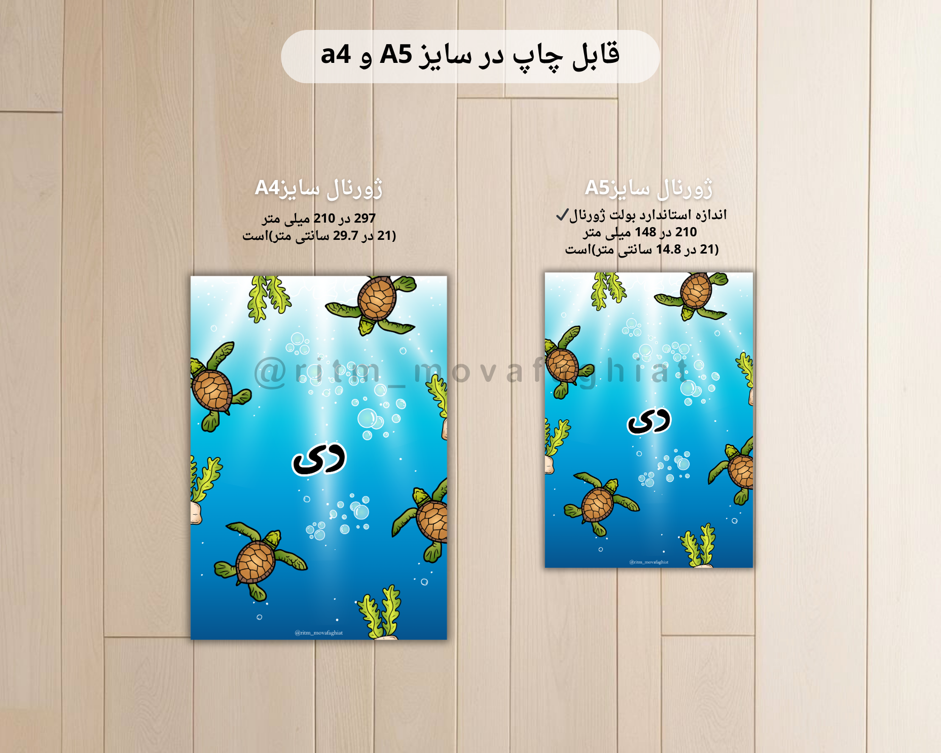 پک ژورنال دی ماه ، شامل 11 صفحه از قبل رنگی شده با طرح لاک پشت دریایی. با تهیه ی بسته {تقویم و عنوان ماه ها} همین طرح ، می توانید آن را تا پایان سال ،هر ماه مجدد چاپ و استفاده کنید. 📑