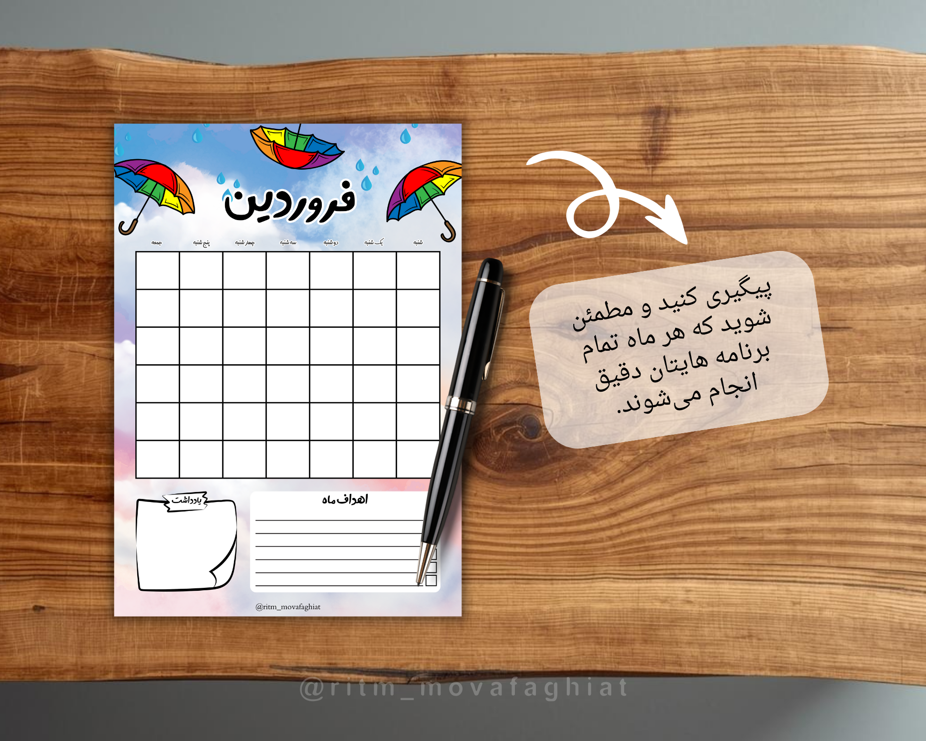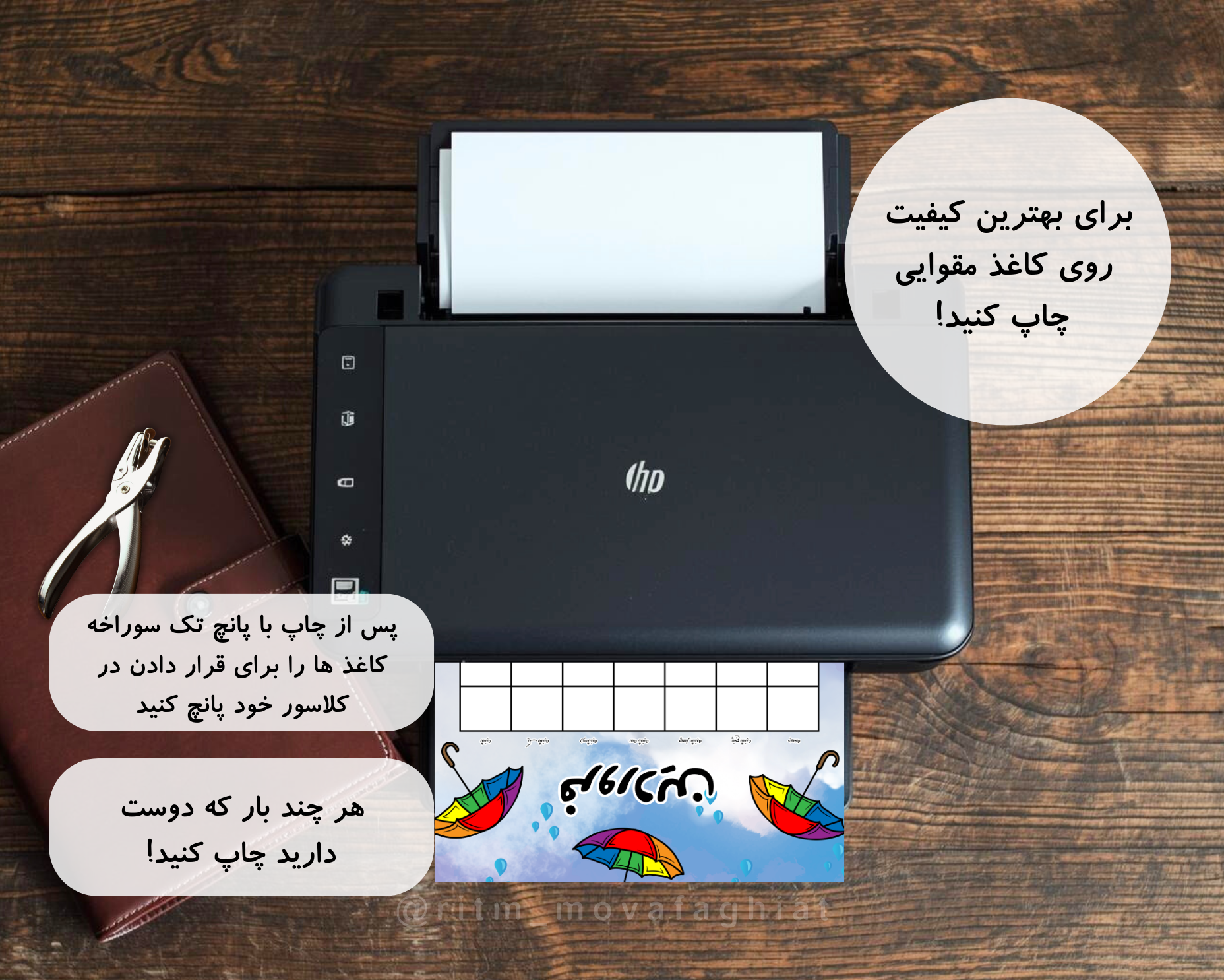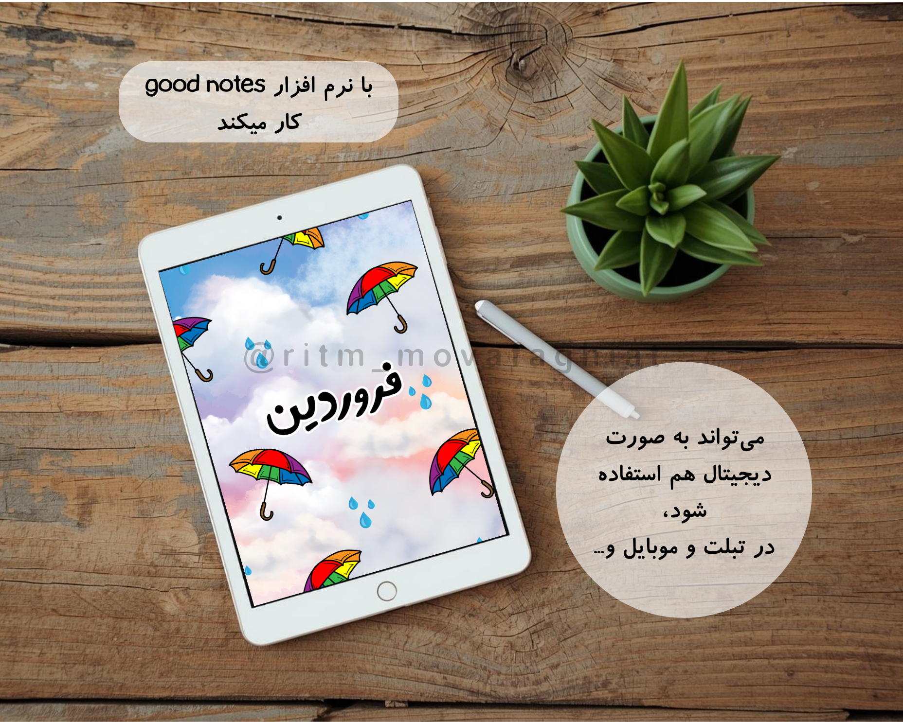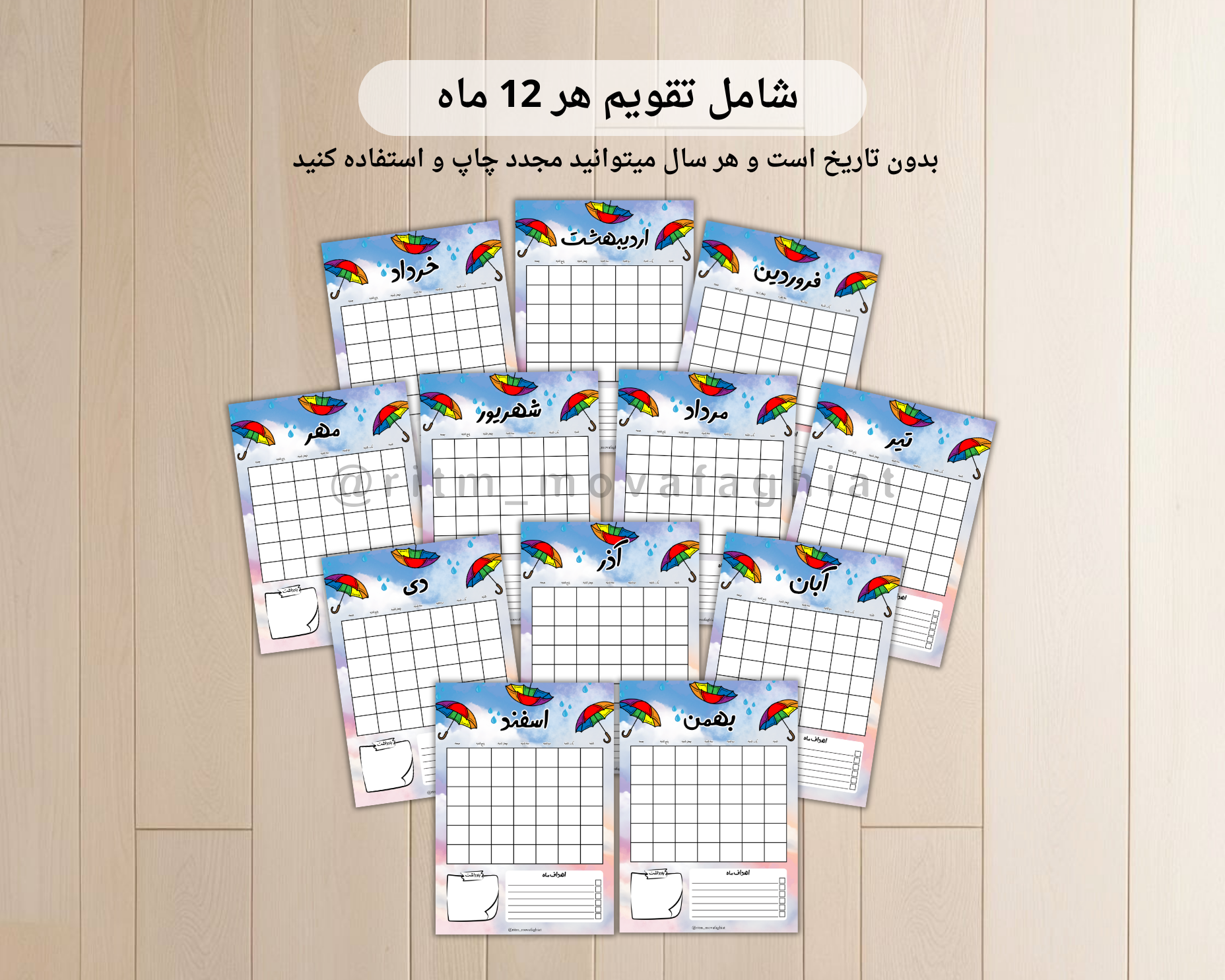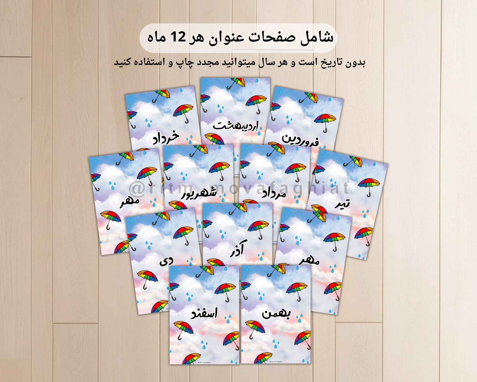 با این بسته می توانید ژورنال رنگی خودتان را تا پایان سال و حتی سال بعد استفاده کنید، تاریخ ندارد و همیشه قابل چاپ است، اگر بسته ژورنال ماهانه طرح چتر و باران، را از قبل خریده اید ، و حالا می خواهید همان طرح را برای کل سال استفاده کنید، این بسته (تقویم و صفحات عنوان ماه) را می توانید تهیه کنید و همراه هم چاپ کنید ، حال یک دفتر بولت ژورنال دارید ک تا پایان سال قابل استفاده است.