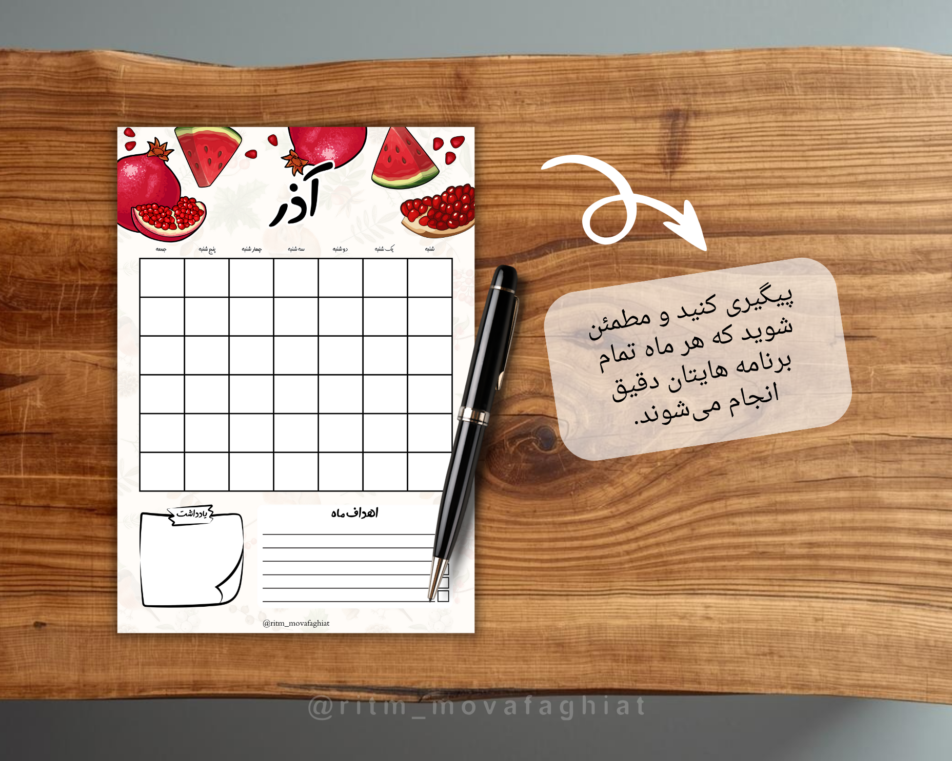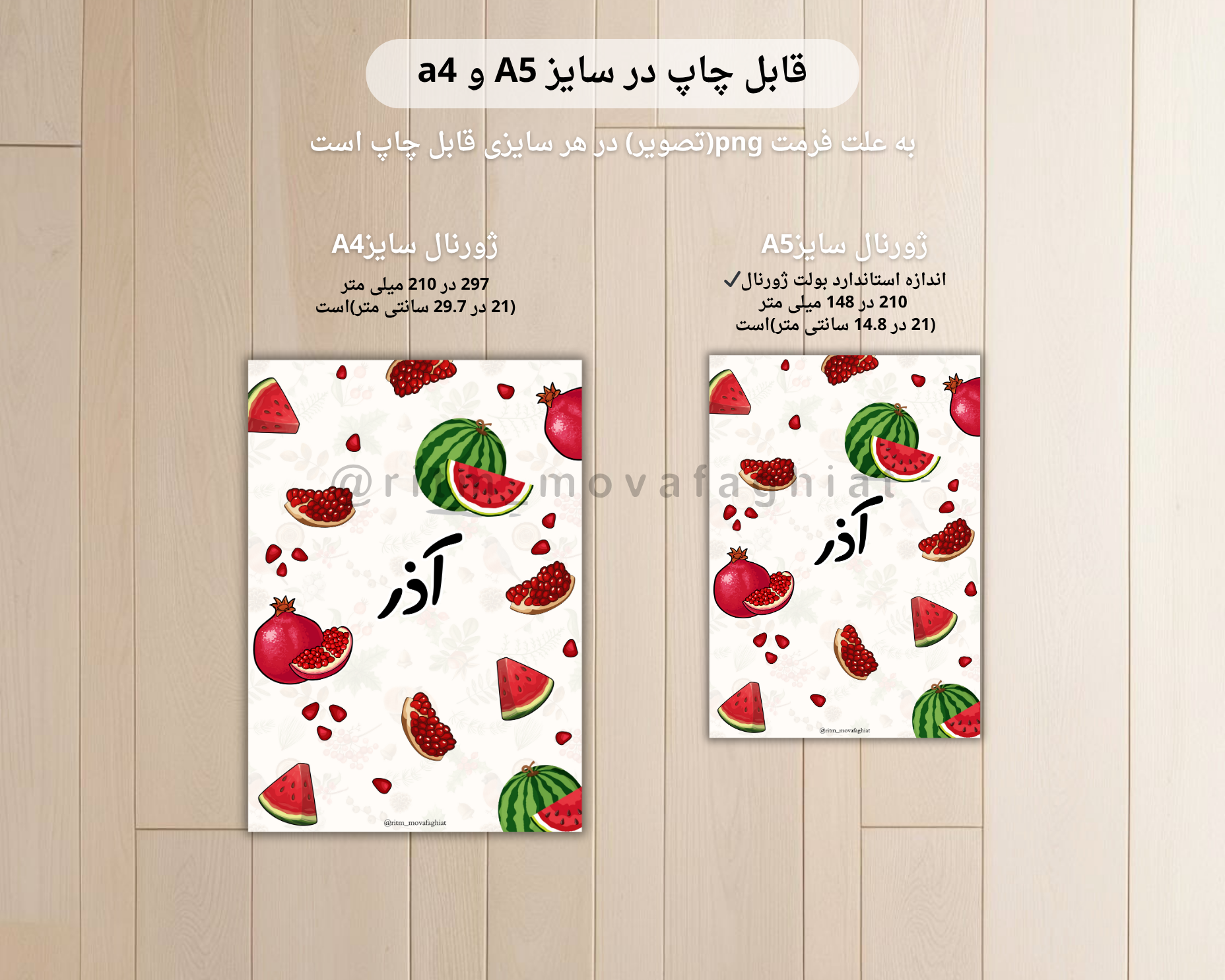 پک ژورنال مناسب آذر ماه ، شامل 11 صفحه از قبل رنگی شده با طرح انار و هندوانه. با تهیه ی بسته {تقویم و عنوان ماه ها} همین طرح ، می توانید آن را تا پایان سال ،هر ماه مجدد چاپ و استفاده کنید. 📑